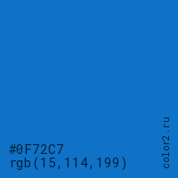 Цвет #0F72C7 в цветовой модели RGB обозначается тремя октетами (15, 114, 199) в десятичном формате и #0F72C7 в шестнадцатиричном (hex) формате, которые являются интенсивностью красного 15 (hex 0F), интенсивность зелёного 114 (hex 72) и интенсивность синего 199 (hex C7).