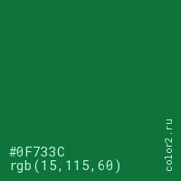 Цвет #0F733C в цветовой модели RGB обозначается тремя октетами (15, 115, 60) в десятичном формате и #0F733C в шестнадцатиричном (hex) формате, которые являются интенсивностью красного 15 (hex 0F), интенсивность зелёного 115 (hex 73) и интенсивность синего 60 (hex 3C).