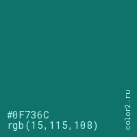 Цвет #0F736C в цветовой модели RGB обозначается тремя октетами (15, 115, 108) в десятичном формате и #0F736C в шестнадцатиричном (hex) формате, которые являются интенсивностью красного 15 (hex 0F), интенсивность зелёного 115 (hex 73) и интенсивность синего 108 (hex 6C).