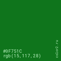 Цвет #0F751C в цветовой модели RGB обозначается тремя октетами (15, 117, 28) в десятичном формате и #0F751C в шестнадцатиричном (hex) формате, которые являются интенсивностью красного 15 (hex 0F), интенсивность зелёного 117 (hex 75) и интенсивность синего 28 (hex 1C).