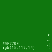Цвет #0F770E в цветовой модели RGB обозначается тремя октетами (15, 119, 14) в десятичном формате и #0F770E в шестнадцатиричном (hex) формате, которые являются интенсивностью красного 15 (hex 0F), интенсивность зелёного 119 (hex 77) и интенсивность синего 14 (hex 0E).