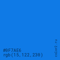 Цвет #0F7AE6 в цветовой модели RGB обозначается тремя октетами (15, 122, 230) в десятичном формате и #0F7AE6 в шестнадцатиричном (hex) формате, которые являются интенсивностью красного 15 (hex 0F), интенсивность зелёного 122 (hex 7A) и интенсивность синего 230 (hex E6).