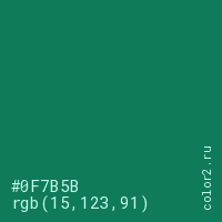 Цвет #0F7B5B в цветовой модели RGB обозначается тремя октетами (15, 123, 91) в десятичном формате и #0F7B5B в шестнадцатиричном (hex) формате, которые являются интенсивностью красного 15 (hex 0F), интенсивность зелёного 123 (hex 7B) и интенсивность синего 91 (hex 5B).