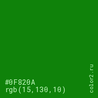 Цвет #0F820A в цветовой модели RGB обозначается тремя октетами (15, 130, 10) в десятичном формате и #0F820A в шестнадцатиричном (hex) формате, которые являются интенсивностью красного 15 (hex 0F), интенсивность зелёного 130 (hex 82) и интенсивность синего 10 (hex 0A).