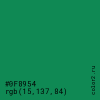 Цвет #0F8954 в цветовой модели RGB обозначается тремя октетами (15, 137, 84) в десятичном формате и #0F8954 в шестнадцатиричном (hex) формате, которые являются интенсивностью красного 15 (hex 0F), интенсивность зелёного 137 (hex 89) и интенсивность синего 84 (hex 54).
