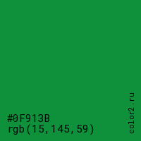 Цвет #0F913B в цветовой модели RGB обозначается тремя октетами (15, 145, 59) в десятичном формате и #0F913B в шестнадцатиричном (hex) формате, которые являются интенсивностью красного 15 (hex 0F), интенсивность зелёного 145 (hex 91) и интенсивность синего 59 (hex 3B).