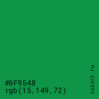 Цвет #0F9548 в цветовой модели RGB обозначается тремя октетами (15, 149, 72) в десятичном формате и #0F9548 в шестнадцатиричном (hex) формате, которые являются интенсивностью красного 15 (hex 0F), интенсивность зелёного 149 (hex 95) и интенсивность синего 72 (hex 48).