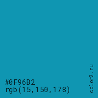 Цвет #0F96B2 в цветовой модели RGB обозначается тремя октетами (15, 150, 178) в десятичном формате и #0F96B2 в шестнадцатиричном (hex) формате, которые являются интенсивностью красного 15 (hex 0F), интенсивность зелёного 150 (hex 96) и интенсивность синего 178 (hex B2).