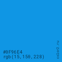 Цвет #0F96E4 в цветовой модели RGB обозначается тремя октетами (15, 150, 228) в десятичном формате и #0F96E4 в шестнадцатиричном (hex) формате, которые являются интенсивностью красного 15 (hex 0F), интенсивность зелёного 150 (hex 96) и интенсивность синего 228 (hex E4).