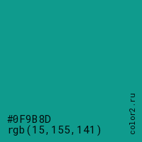 Цвет #0F9B8D в цветовой модели RGB обозначается тремя октетами (15, 155, 141) в десятичном формате и #0F9B8D в шестнадцатиричном (hex) формате, которые являются интенсивностью красного 15 (hex 0F), интенсивность зелёного 155 (hex 9B) и интенсивность синего 141 (hex 8D).