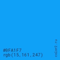 Цвет #0FA1F7 в цветовой модели RGB обозначается тремя октетами (15, 161, 247) в десятичном формате и #0FA1F7 в шестнадцатиричном (hex) формате, которые являются интенсивностью красного 15 (hex 0F), интенсивность зелёного 161 (hex A1) и интенсивность синего 247 (hex F7).