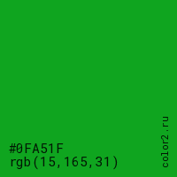 Цвет #0FA51F в цветовой модели RGB обозначается тремя октетами (15, 165, 31) в десятичном формате и #0FA51F в шестнадцатиричном (hex) формате, которые являются интенсивностью красного 15 (hex 0F), интенсивность зелёного 165 (hex A5) и интенсивность синего 31 (hex 1F).