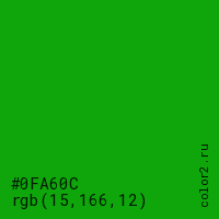 Цвет #0FA60C в цветовой модели RGB обозначается тремя октетами (15, 166, 12) в десятичном формате и #0FA60C в шестнадцатиричном (hex) формате, которые являются интенсивностью красного 15 (hex 0F), интенсивность зелёного 166 (hex A6) и интенсивность синего 12 (hex 0C).