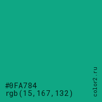 Цвет #0FA784 в цветовой модели RGB обозначается тремя октетами (15, 167, 132) в десятичном формате и #0FA784 в шестнадцатиричном (hex) формате, которые являются интенсивностью красного 15 (hex 0F), интенсивность зелёного 167 (hex A7) и интенсивность синего 132 (hex 84).