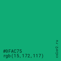 Цвет #0FAC75 в цветовой модели RGB обозначается тремя октетами (15, 172, 117) в десятичном формате и #0FAC75 в шестнадцатиричном (hex) формате, которые являются интенсивностью красного 15 (hex 0F), интенсивность зелёного 172 (hex AC) и интенсивность синего 117 (hex 75).