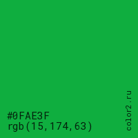 Цвет #0FAE3F в цветовой модели RGB обозначается тремя октетами (15, 174, 63) в десятичном формате и #0FAE3F в шестнадцатиричном (hex) формате, которые являются интенсивностью красного 15 (hex 0F), интенсивность зелёного 174 (hex AE) и интенсивность синего 63 (hex 3F).