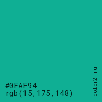 Цвет #0FAF94 в цветовой модели RGB обозначается тремя октетами (15, 175, 148) в десятичном формате и #0FAF94 в шестнадцатиричном (hex) формате, которые являются интенсивностью красного 15 (hex 0F), интенсивность зелёного 175 (hex AF) и интенсивность синего 148 (hex 94).