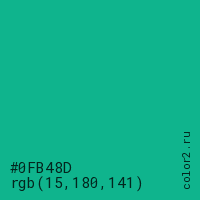 Цвет #0FB48D в цветовой модели RGB обозначается тремя октетами (15, 180, 141) в десятичном формате и #0FB48D в шестнадцатиричном (hex) формате, которые являются интенсивностью красного 15 (hex 0F), интенсивность зелёного 180 (hex B4) и интенсивность синего 141 (hex 8D).