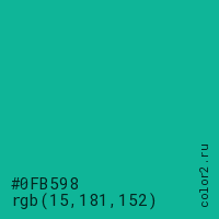 Цвет #0FB598 в цветовой модели RGB обозначается тремя октетами (15, 181, 152) в десятичном формате и #0FB598 в шестнадцатиричном (hex) формате, которые являются интенсивностью красного 15 (hex 0F), интенсивность зелёного 181 (hex B5) и интенсивность синего 152 (hex 98).