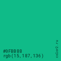 Цвет #0FBB88 в цветовой модели RGB обозначается тремя октетами (15, 187, 136) в десятичном формате и #0FBB88 в шестнадцатиричном (hex) формате, которые являются интенсивностью красного 15 (hex 0F), интенсивность зелёного 187 (hex BB) и интенсивность синего 136 (hex 88).