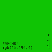 Цвет #0FC404 в цветовой модели RGB обозначается тремя октетами (15, 196, 4) в десятичном формате и #0FC404 в шестнадцатиричном (hex) формате, которые являются интенсивностью красного 15 (hex 0F), интенсивность зелёного 196 (hex C4) и интенсивность синего 4 (hex 04).