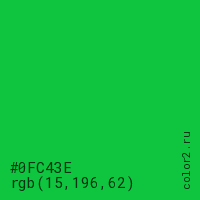 Цвет #0FC43E в цветовой модели RGB обозначается тремя октетами (15, 196, 62) в десятичном формате и #0FC43E в шестнадцатиричном (hex) формате, которые являются интенсивностью красного 15 (hex 0F), интенсивность зелёного 196 (hex C4) и интенсивность синего 62 (hex 3E).