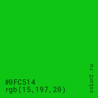 Цвет #0FC514 в цветовой модели RGB обозначается тремя октетами (15, 197, 20) в десятичном формате и #0FC514 в шестнадцатиричном (hex) формате, которые являются интенсивностью красного 15 (hex 0F), интенсивность зелёного 197 (hex C5) и интенсивность синего 20 (hex 14).