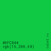 Цвет #0FC844 в цветовой модели RGB обозначается тремя октетами (15, 200, 68) в десятичном формате и #0FC844 в шестнадцатиричном (hex) формате, которые являются интенсивностью красного 15 (hex 0F), интенсивность зелёного 200 (hex C8) и интенсивность синего 68 (hex 44).