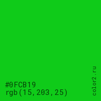Цвет #0FCB19 в цветовой модели RGB обозначается тремя октетами (15, 203, 25) в десятичном формате и #0FCB19 в шестнадцатиричном (hex) формате, которые являются интенсивностью красного 15 (hex 0F), интенсивность зелёного 203 (hex CB) и интенсивность синего 25 (hex 19).