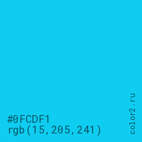 Цвет #0FCDF1 в цветовой модели RGB обозначается тремя октетами (15, 205, 241) в десятичном формате и #0FCDF1 в шестнадцатиричном (hex) формате, которые являются интенсивностью красного 15 (hex 0F), интенсивность зелёного 205 (hex CD) и интенсивность синего 241 (hex F1).