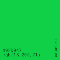 Цвет #0FD047 в цветовой модели RGB обозначается тремя октетами (15, 208, 71) в десятичном формате и #0FD047 в шестнадцатиричном (hex) формате, которые являются интенсивностью красного 15 (hex 0F), интенсивность зелёного 208 (hex D0) и интенсивность синего 71 (hex 47).