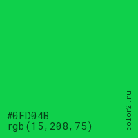 Цвет #0FD04B в цветовой модели RGB обозначается тремя октетами (15, 208, 75) в десятичном формате и #0FD04B в шестнадцатиричном (hex) формате, которые являются интенсивностью красного 15 (hex 0F), интенсивность зелёного 208 (hex D0) и интенсивность синего 75 (hex 4B).