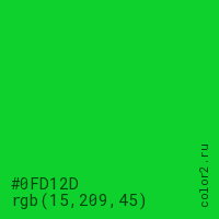 Цвет #0FD12D в цветовой модели RGB обозначается тремя октетами (15, 209, 45) в десятичном формате и #0FD12D в шестнадцатиричном (hex) формате, которые являются интенсивностью красного 15 (hex 0F), интенсивность зелёного 209 (hex D1) и интенсивность синего 45 (hex 2D).