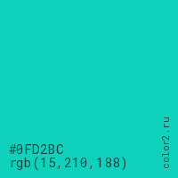 Цвет #0FD2BC в цветовой модели RGB обозначается тремя октетами (15, 210, 188) в десятичном формате и #0FD2BC в шестнадцатиричном (hex) формате, которые являются интенсивностью красного 15 (hex 0F), интенсивность зелёного 210 (hex D2) и интенсивность синего 188 (hex BC).