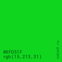 Цвет #0FD51F в цветовой модели RGB обозначается тремя октетами (15, 213, 31) в десятичном формате и #0FD51F в шестнадцатиричном (hex) формате, которые являются интенсивностью красного 15 (hex 0F), интенсивность зелёного 213 (hex D5) и интенсивность синего 31 (hex 1F).