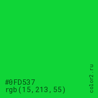 Цвет #0FD537 в цветовой модели RGB обозначается тремя октетами (15, 213, 55) в десятичном формате и #0FD537 в шестнадцатиричном (hex) формате, которые являются интенсивностью красного 15 (hex 0F), интенсивность зелёного 213 (hex D5) и интенсивность синего 55 (hex 37).