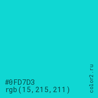 Цвет #0FD7D3 в цветовой модели RGB обозначается тремя октетами (15, 215, 211) в десятичном формате и #0FD7D3 в шестнадцатиричном (hex) формате, которые являются интенсивностью красного 15 (hex 0F), интенсивность зелёного 215 (hex D7) и интенсивность синего 211 (hex D3).