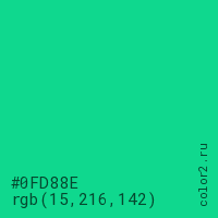 Цвет #0FD88E в цветовой модели RGB обозначается тремя октетами (15, 216, 142) в десятичном формате и #0FD88E в шестнадцатиричном (hex) формате, которые являются интенсивностью красного 15 (hex 0F), интенсивность зелёного 216 (hex D8) и интенсивность синего 142 (hex 8E).