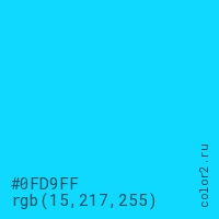 Цвет #0FD9FF в цветовой модели RGB обозначается тремя октетами (15, 217, 255) в десятичном формате и #0FD9FF в шестнадцатиричном (hex) формате, которые являются интенсивностью красного 15 (hex 0F), интенсивность зелёного 217 (hex D9) и интенсивность синего 255 (hex FF).