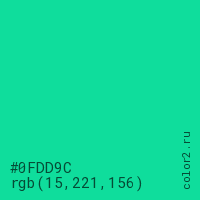 Цвет #0FDD9C в цветовой модели RGB обозначается тремя октетами (15, 221, 156) в десятичном формате и #0FDD9C в шестнадцатиричном (hex) формате, которые являются интенсивностью красного 15 (hex 0F), интенсивность зелёного 221 (hex DD) и интенсивность синего 156 (hex 9C).