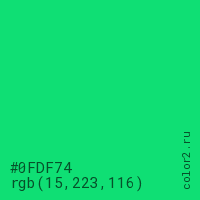 Цвет #0FDF74 в цветовой модели RGB обозначается тремя октетами (15, 223, 116) в десятичном формате и #0FDF74 в шестнадцатиричном (hex) формате, которые являются интенсивностью красного 15 (hex 0F), интенсивность зелёного 223 (hex DF) и интенсивность синего 116 (hex 74).