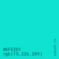 Цвет #0FE2D1 в цветовой модели RGB обозначается тремя октетами (15, 226, 209) в десятичном формате и #0FE2D1 в шестнадцатиричном (hex) формате, которые являются интенсивностью красного 15 (hex 0F), интенсивность зелёного 226 (hex E2) и интенсивность синего 209 (hex D1).