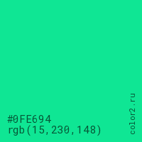 Цвет #0FE694 в цветовой модели RGB обозначается тремя октетами (15, 230, 148) в десятичном формате и #0FE694 в шестнадцатиричном (hex) формате, которые являются интенсивностью красного 15 (hex 0F), интенсивность зелёного 230 (hex E6) и интенсивность синего 148 (hex 94).
