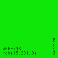 Цвет #0FE708 в цветовой модели RGB обозначается тремя октетами (15, 231, 8) в десятичном формате и #0FE708 в шестнадцатиричном (hex) формате, которые являются интенсивностью красного 15 (hex 0F), интенсивность зелёного 231 (hex E7) и интенсивность синего 8 (hex 08).