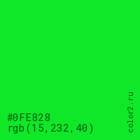 Цвет #0FE828 в цветовой модели RGB обозначается тремя октетами (15, 232, 40) в десятичном формате и #0FE828 в шестнадцатиричном (hex) формате, которые являются интенсивностью красного 15 (hex 0F), интенсивность зелёного 232 (hex E8) и интенсивность синего 40 (hex 28).