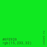 Цвет #0FE920 в цветовой модели RGB обозначается тремя октетами (15, 233, 32) в десятичном формате и #0FE920 в шестнадцатиричном (hex) формате, которые являются интенсивностью красного 15 (hex 0F), интенсивность зелёного 233 (hex E9) и интенсивность синего 32 (hex 20).