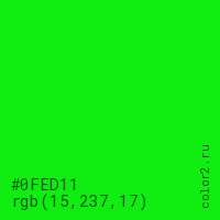 Цвет #0FED11 в цветовой модели RGB обозначается тремя октетами (15, 237, 17) в десятичном формате и #0FED11 в шестнадцатиричном (hex) формате, которые являются интенсивностью красного 15 (hex 0F), интенсивность зелёного 237 (hex ED) и интенсивность синего 17 (hex 11).
