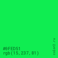 Цвет #0FED51 в цветовой модели RGB обозначается тремя октетами (15, 237, 81) в десятичном формате и #0FED51 в шестнадцатиричном (hex) формате, которые являются интенсивностью красного 15 (hex 0F), интенсивность зелёного 237 (hex ED) и интенсивность синего 81 (hex 51).