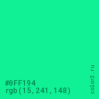 Цвет #0FF194 в цветовой модели RGB обозначается тремя октетами (15, 241, 148) в десятичном формате и #0FF194 в шестнадцатиричном (hex) формате, которые являются интенсивностью красного 15 (hex 0F), интенсивность зелёного 241 (hex F1) и интенсивность синего 148 (hex 94).