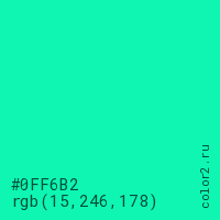Цвет #0FF6B2 в цветовой модели RGB обозначается тремя октетами (15, 246, 178) в десятичном формате и #0FF6B2 в шестнадцатиричном (hex) формате, которые являются интенсивностью красного 15 (hex 0F), интенсивность зелёного 246 (hex F6) и интенсивность синего 178 (hex B2).